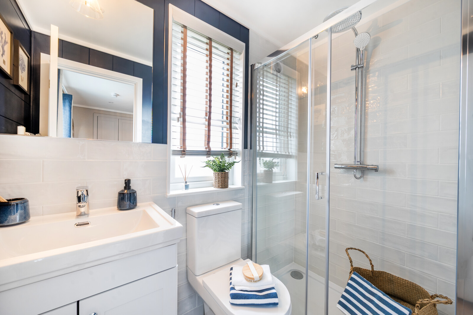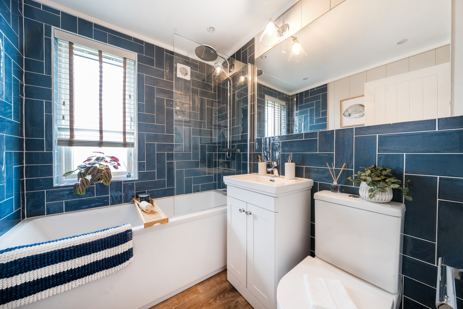 In the main bathroom, you’ll find a serene retreat. Featuring a full-size bath with an overhead waterfall shower, a sleek glass screen, and a contemporary vanity unit, this space is designed to offer both practicality and elegance. Finishing touches such as a wall-mounted backlit LED mirror and Venetian blind enhance the feeling of luxury.