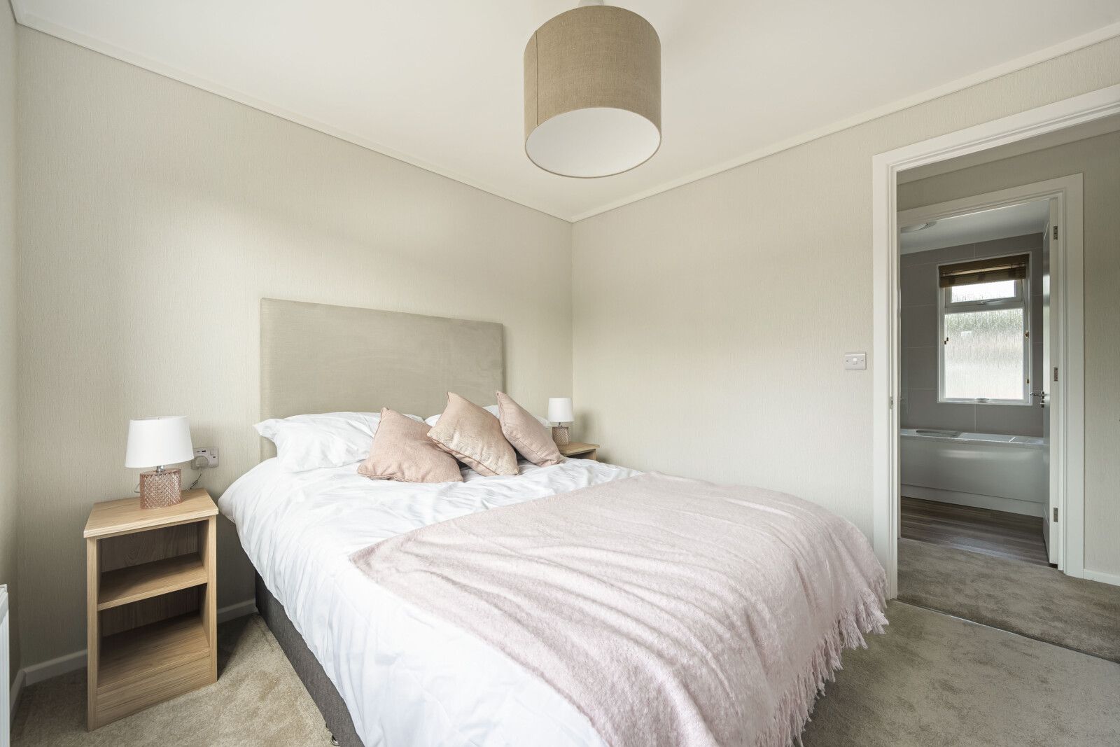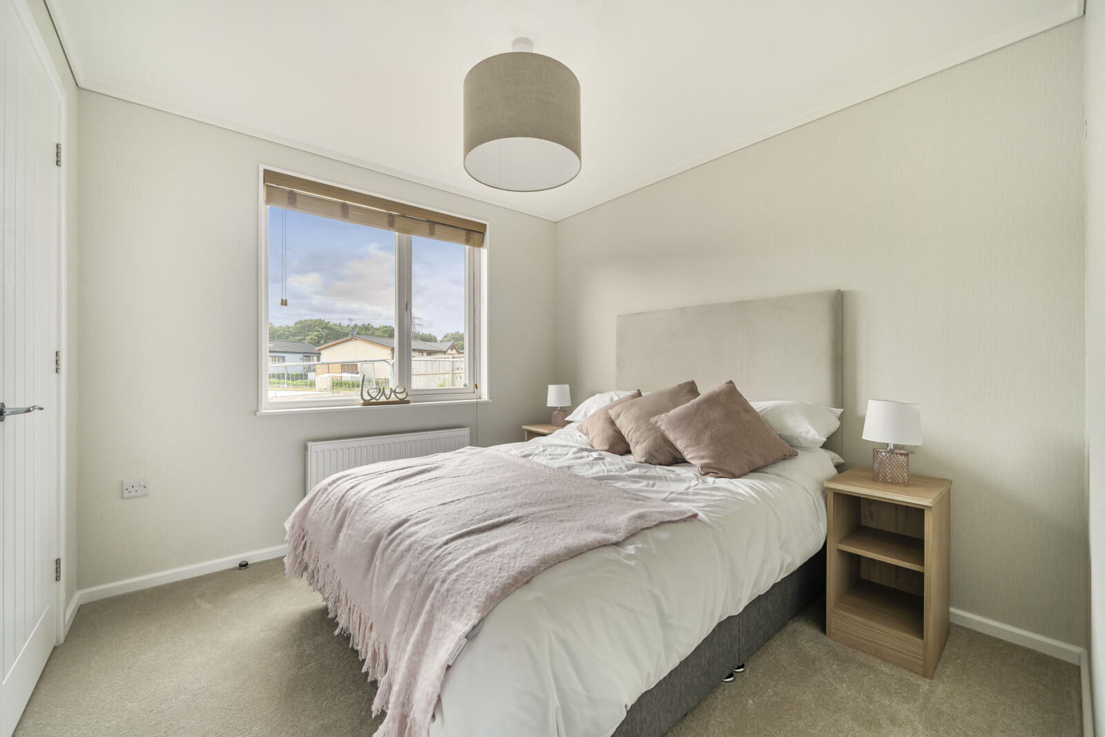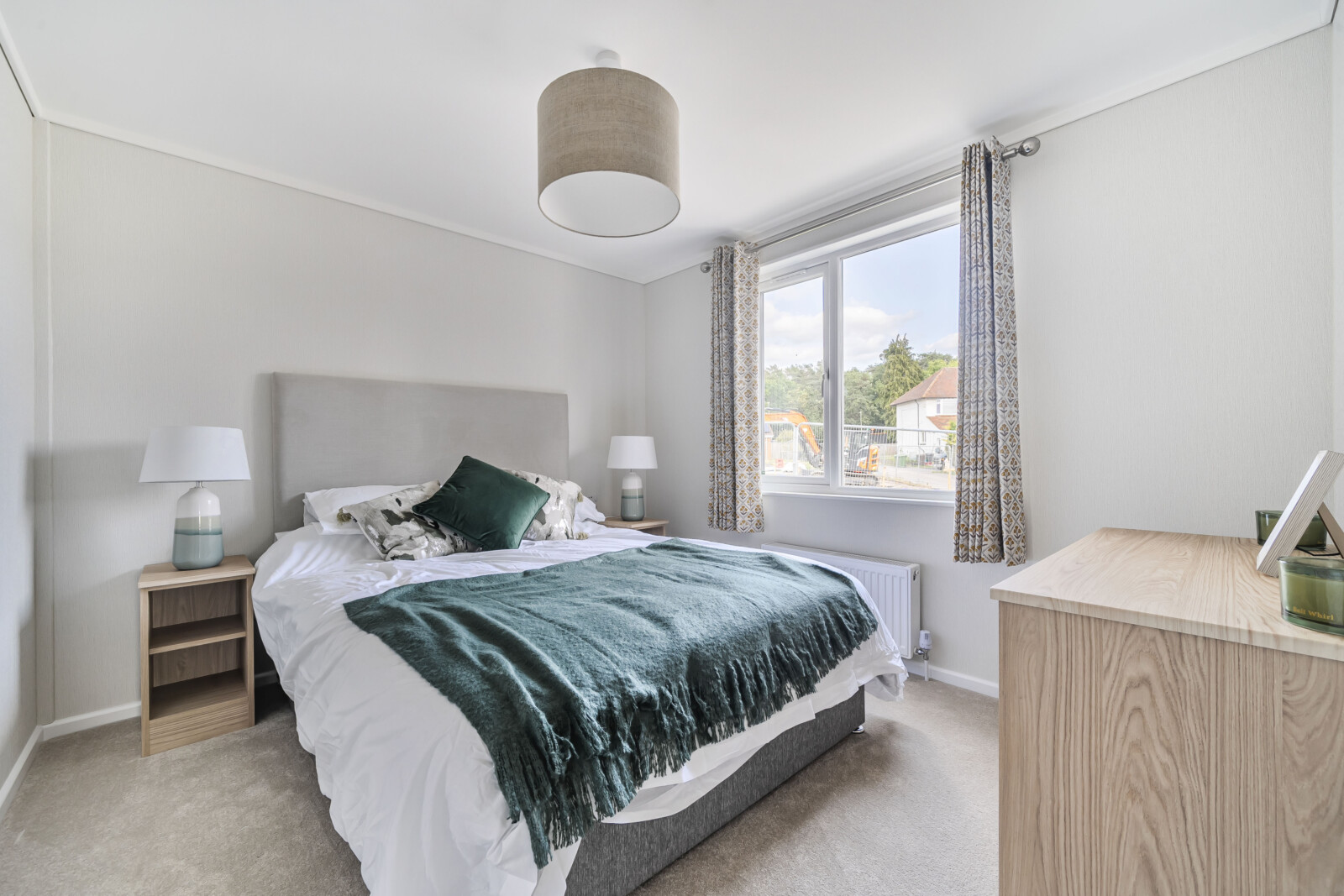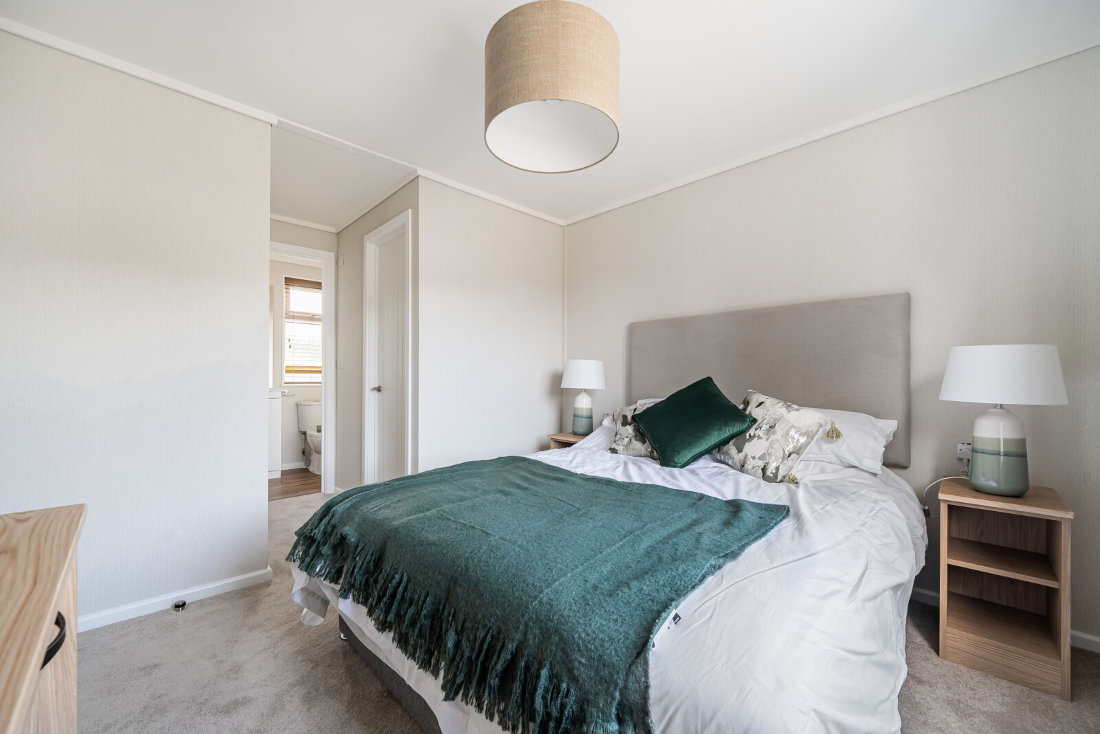The secondary bedroom is equally inviting, offering the same superior level of comfort and thoughtful design. With its double bed, padded headboard, coordinated furnishings, and practical storage options, it’s the ideal space for accommodating friends or family.