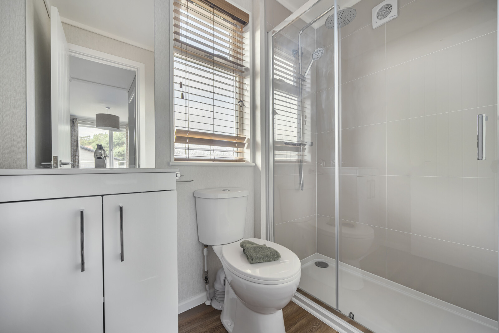 The main bathroom offers a tranquil retreat with its shower over bath, complemented by a sleek wall-mounted mirror and vanity unit. The Venetian blind provides privacy, while the durable vinyl flooring ensures both practicality and style.