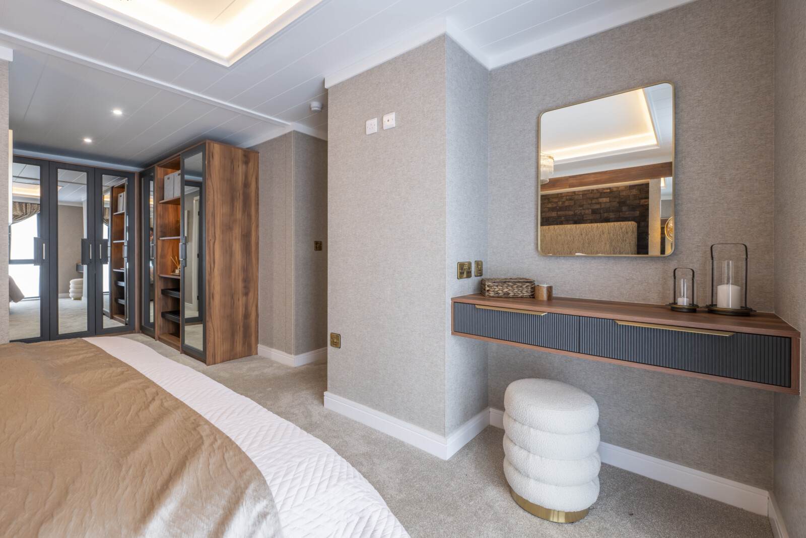 The master suite offers a sanctuary of calm with a feature wall, king-size bed, and generous walk-in dressing area complete with shelving, wardrobe space, and shoe racks. The en-suite bathroom is finished to a premium standard, with his and hers basins, a walk-in shower and a drench shower head. The second bedroom mirrors the high design standard with integrated storage and stylish furnishings. A family bathroom completes the home, with a sculptural freestanding bath, ambient lighting, and sleek contemporary finishes.