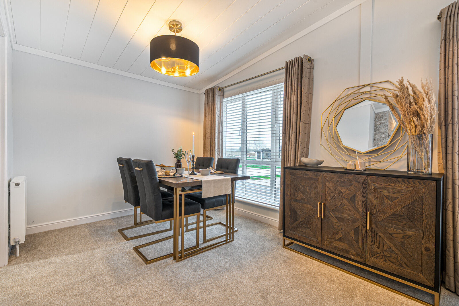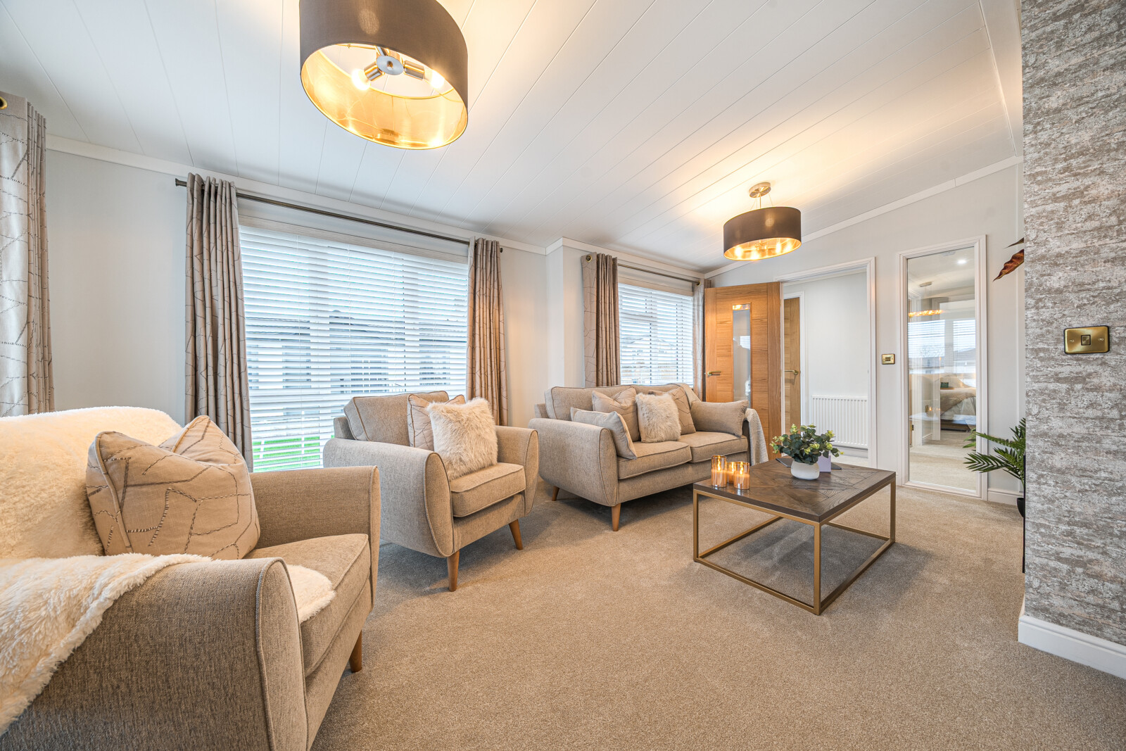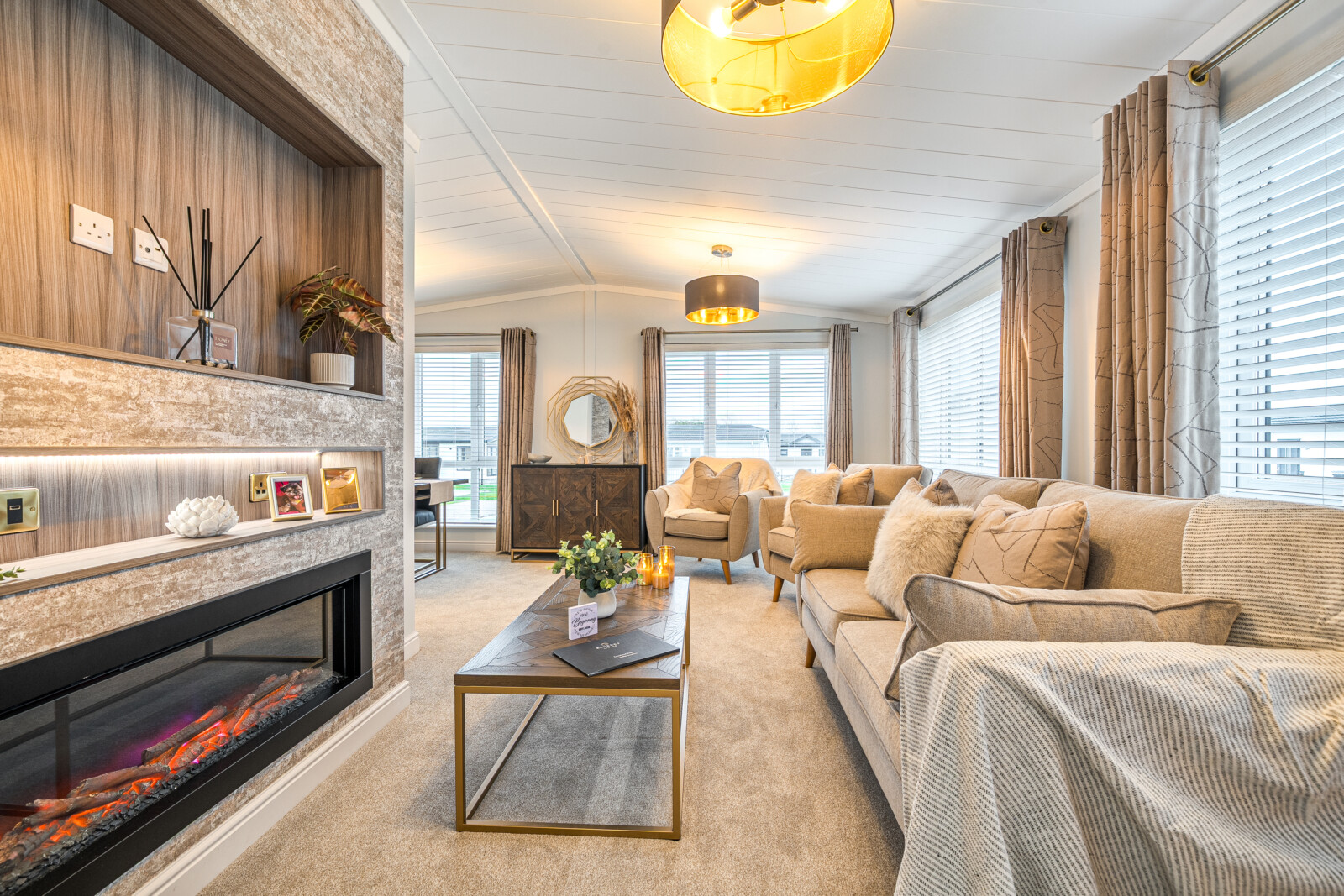 As you step inside, you are welcomed by a spacious and inviting lounge and dining area. The large picture windows and feature glazing from the hall flood the living space with natural light, enhancing the sense of openness. This is a place where comfort meets style, with contemporary touches such as a sleek electric fire framed by a soft white surround, luxurious Combi-Bac carpet with underlay, and full-length, fully lined curtains. The carefully chosen furniture, from the contemporary coffee table to the stylish dining set, adds to the home’s charming ambience. For those working from home, selected floor plans offer the convenience of a fitted study complete with a corner desk and office chair, making this Park Bungalow as practical as it is beautiful.