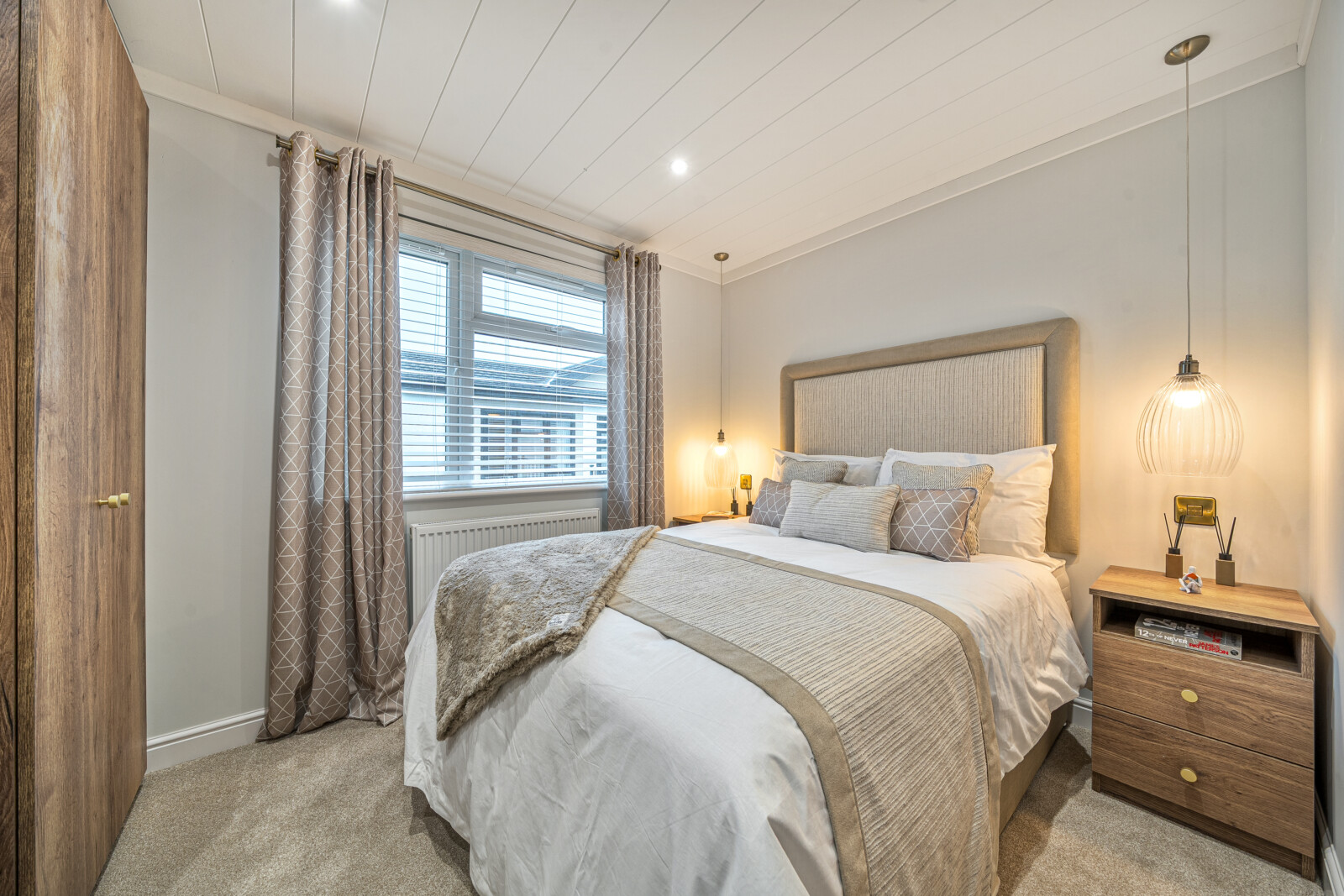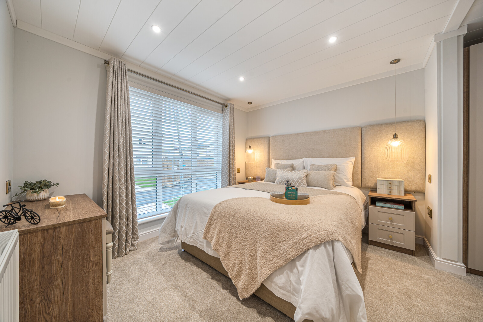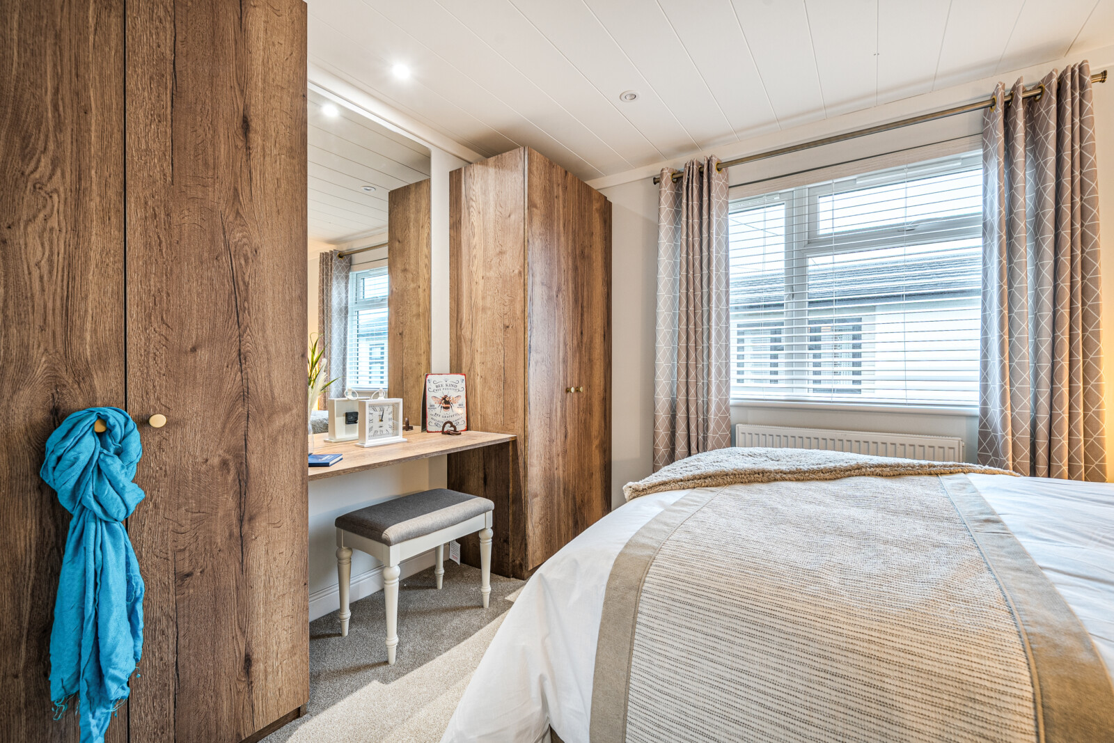 As you step inside, you are welcomed by a spacious and inviting lounge and dining area. The large picture windows and feature glazing from the hall flood the living space with natural light, enhancing the sense of openness. This is a place where comfort meets style, with contemporary touches such as a sleek electric fire framed by a soft white surround, luxurious Combi-Bac carpet with underlay, and full-length, fully lined curtains. The carefully chosen furniture, from the contemporary coffee table to the stylish dining set, adds to the home’s charming ambience. For those working from home, selected floor plans offer the convenience of a fitted study complete with a corner desk and office chair, making this Park Bungalow as practical as it is beautiful.