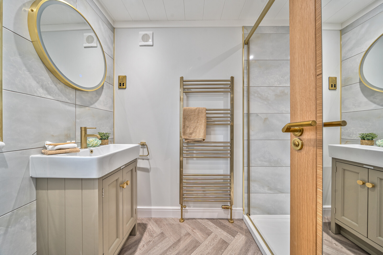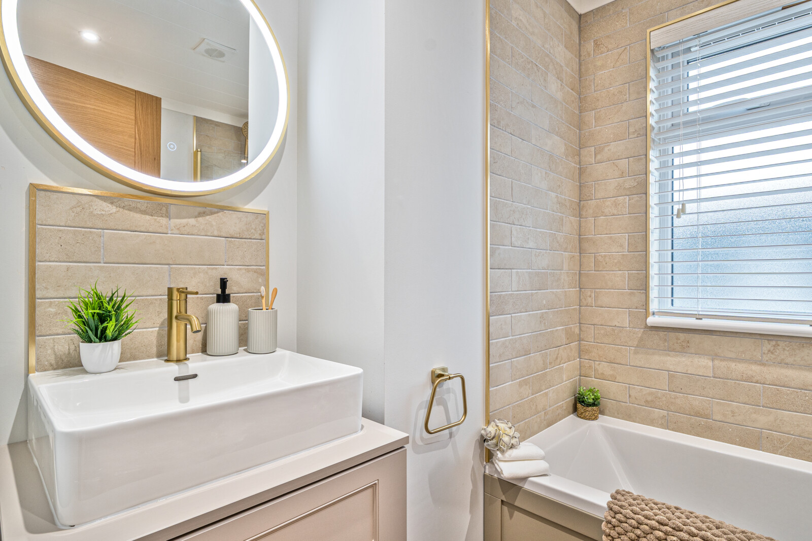 Both bedrooms exude a wonderful sense of relaxation and tranquillity. Large windows allow natural light to pour in, creating an airy, serene environment. The primary bedroom benefits from an en-suite, complete with a floor-standing vanity unit and a sit-on basin. The room offers a dressing area with double wardrobes and fitted furniture, ensuring ample storage space without compromising on style. The main bathroom is equally well-appointed, with modern finishes and practical touches like a Venetian blind. Throughout, there are thoughtful features such as USB charging points, making the home well-suited to modern living.