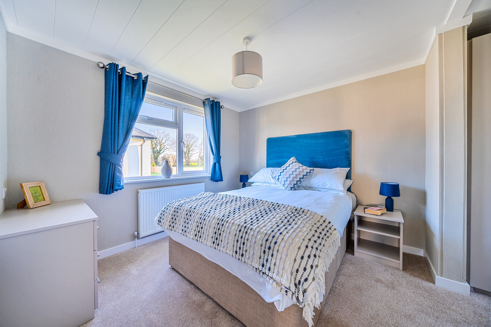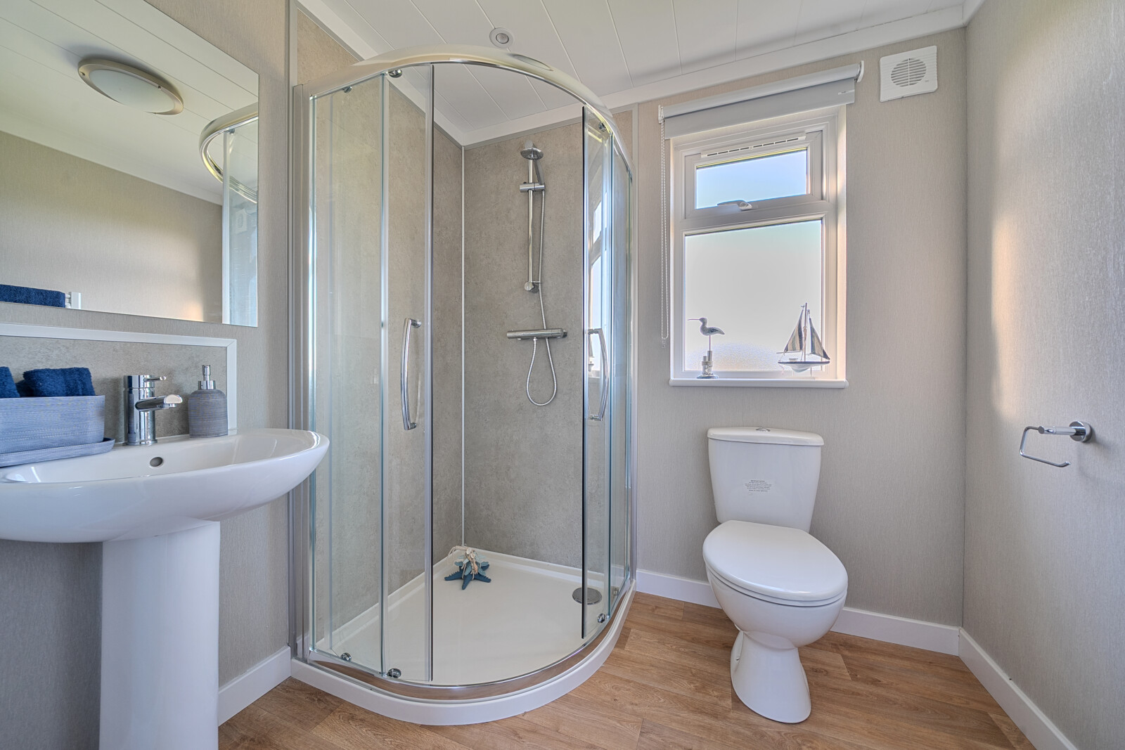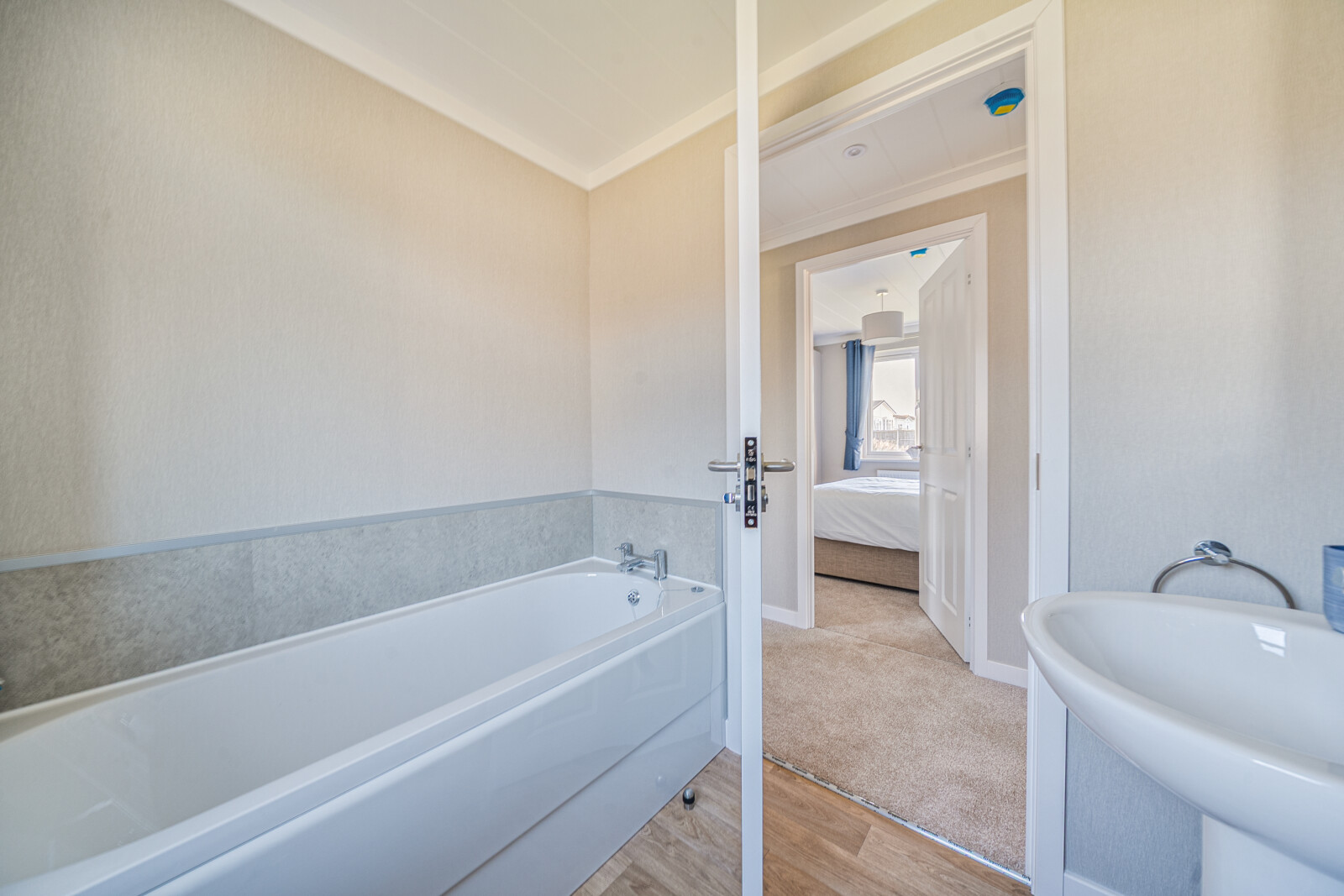 The bedrooms in the Westbury offer a peaceful retreat, with the master bedroom featuring a dressing area and en-suite shower room. Thoughtfully designed to provide maximum comfort, this space includes a walk-in wardrobe, wall-mounted headboards, and coordinated bedding, ensuring a restful night’s sleep. Combi-Bac carpet with underlay adds a touch of luxury underfoot, while the family bathroom is fitted with stylish fixtures and practical vinyl flooring, seamlessly blending convenience with elegance.