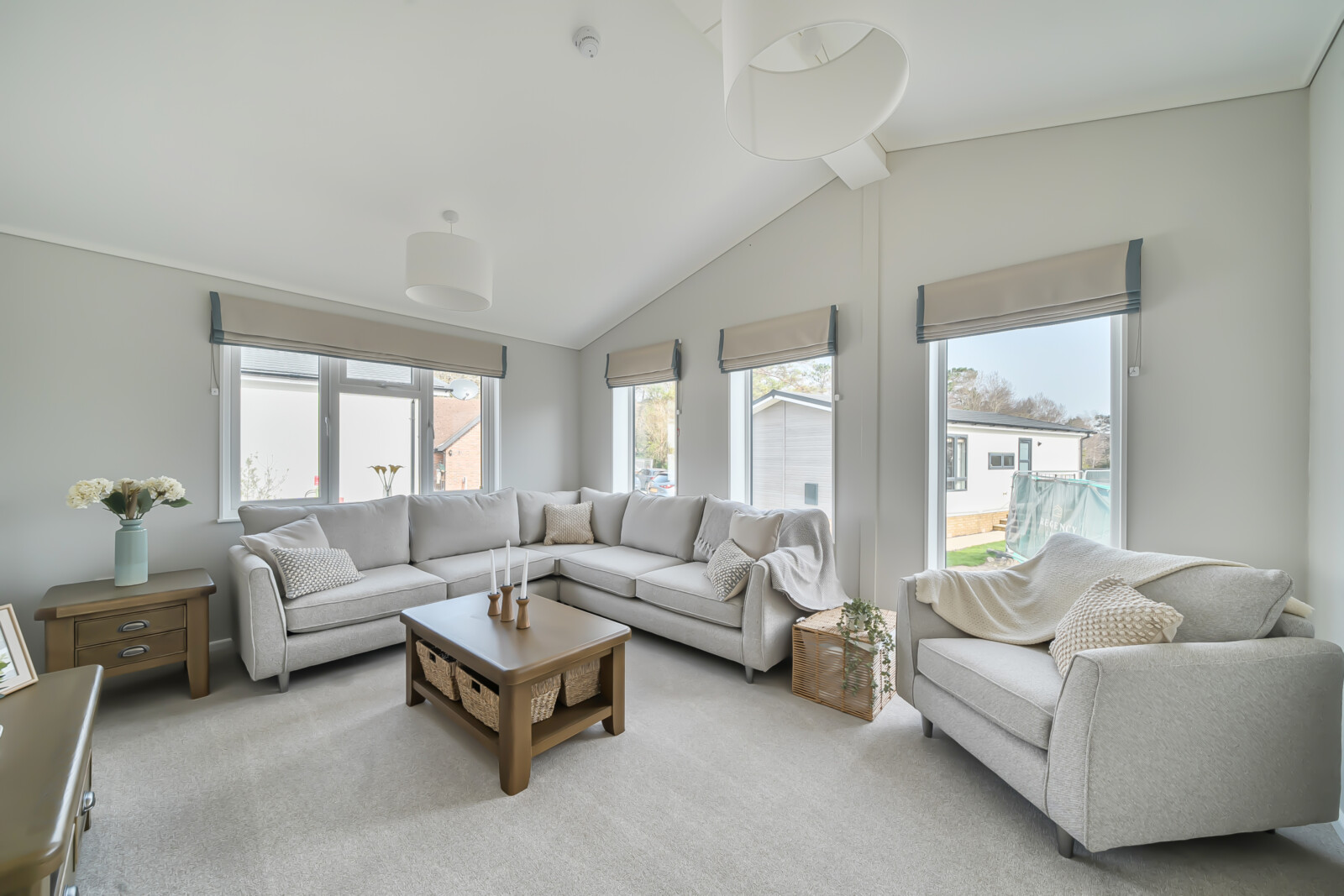 From the moment you step inside, you’ll notice the superior craftsmanship and carefully curated design. Vaulted ceilings create a light and airy atmosphere, while the included designer furnishings ensure a seamless move-in experience. A sumptuous corner sofa and coordinating armchair set the tone for the stylish lounge, enhanced by elegant Roman and Venetian blinds for a perfect balance of privacy and natural light.