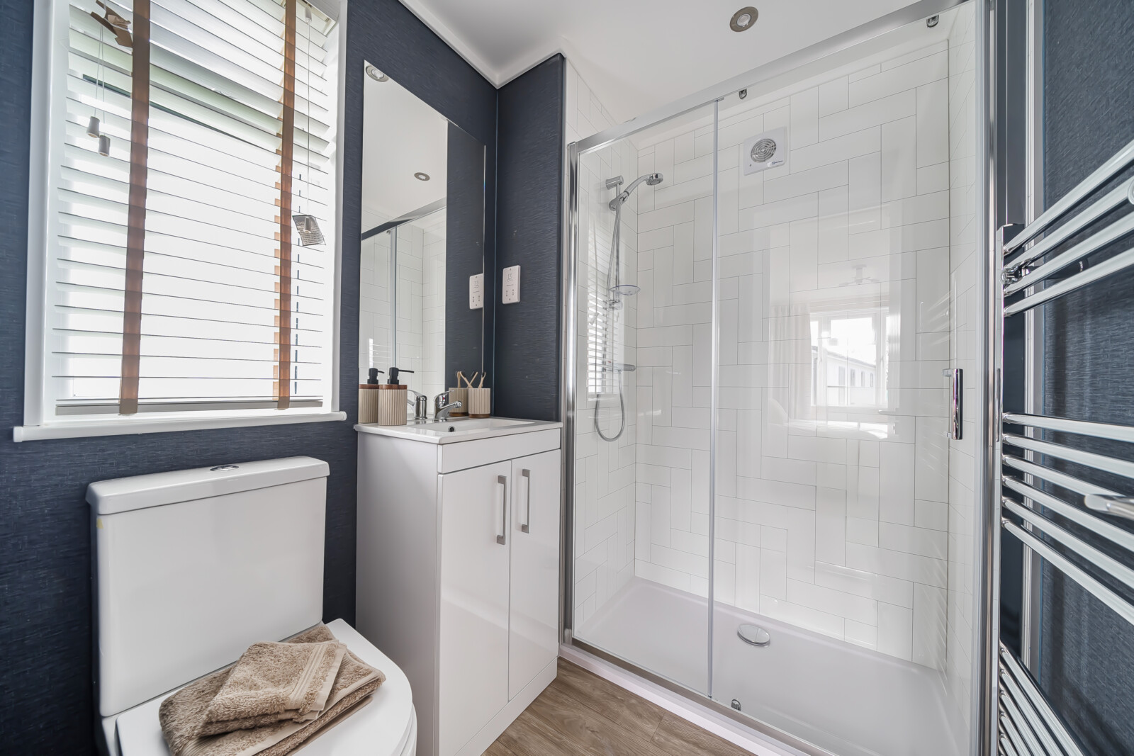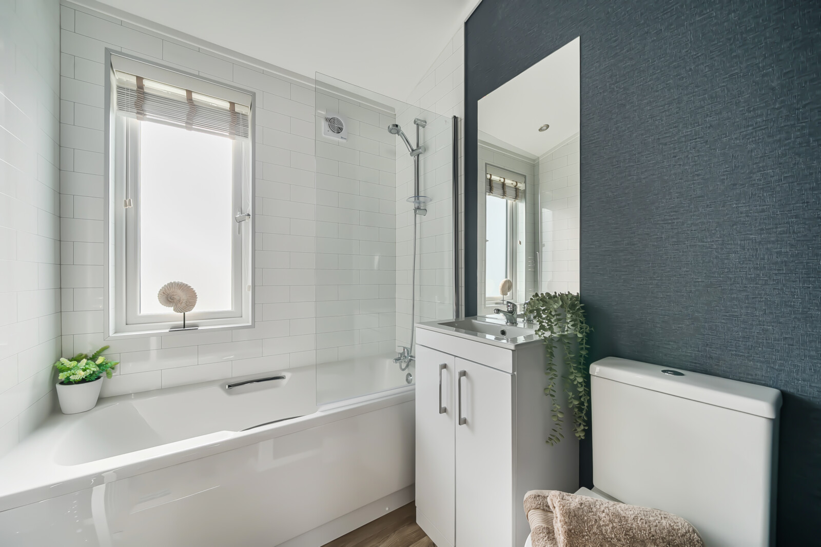 The main bathroom offers a serene escape, featuring a full-size bath, chrome towel radiator, and sophisticated décor. From the carefully chosen flooring to the soft furnishings, every element enhances the home’s inviting ambience.