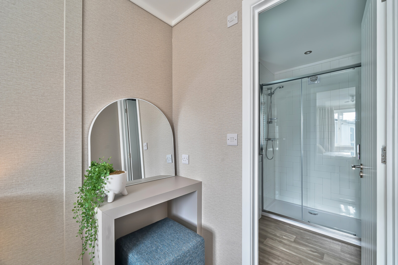 The primary bedroom is a sanctuary of comfort, featuring a superior king-size bed with a padded headboard, a striking feature wall, and built-in mirrored wardrobes for effortless storage. The en-suite shower room continues the theme of understated luxury, complete with a walk-in shower, chrome towel radiator, and elegant finishes. The guest bedroom mirrors this sense of style, offering a double bed, plush headboard, and mirrored wardrobe to create a welcoming retreat for visitors.