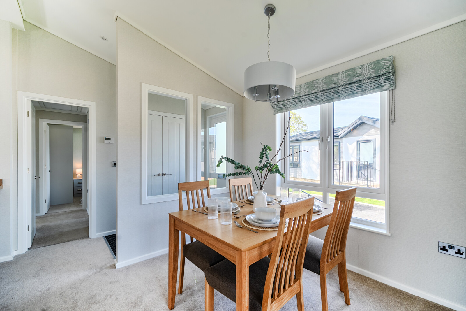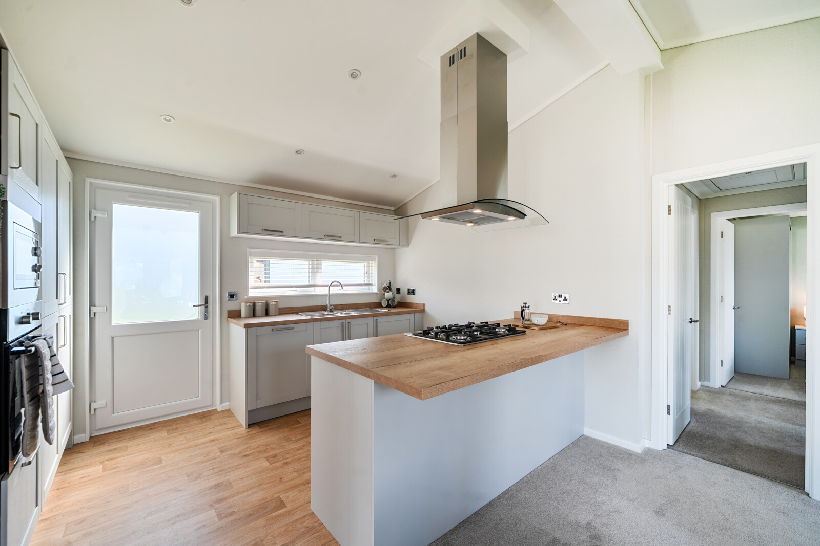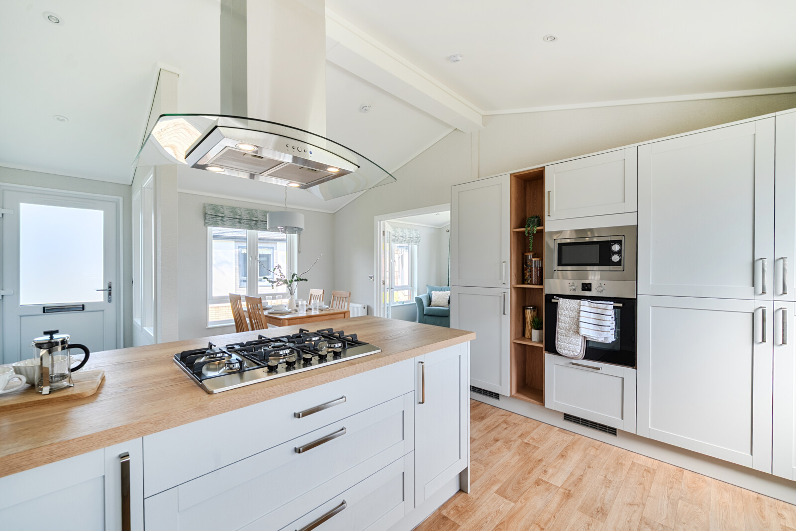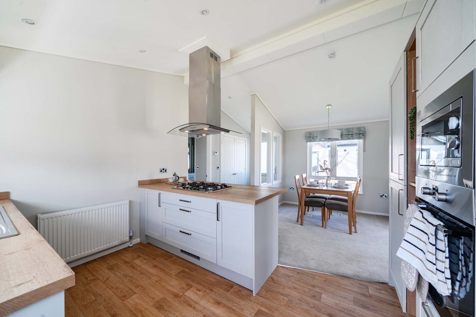 Moving through the grand double doors, you enter the substantial kitchen and dining area. The vaulted ceilings and fully glazed doors enhance the sense of space and light. The shaker-style kitchen units and oak-effect worktops combine beauty and practicality. The kitchen is fully equipped with an electric single eye-level oven, a five-burner gas hob, and integrated appliances including a fridge/freezer, microwave, dishwasher, and washing machine. The dining table and chairs provide a delightful space for meals and conversations, set against the backdrop of contemporary design.