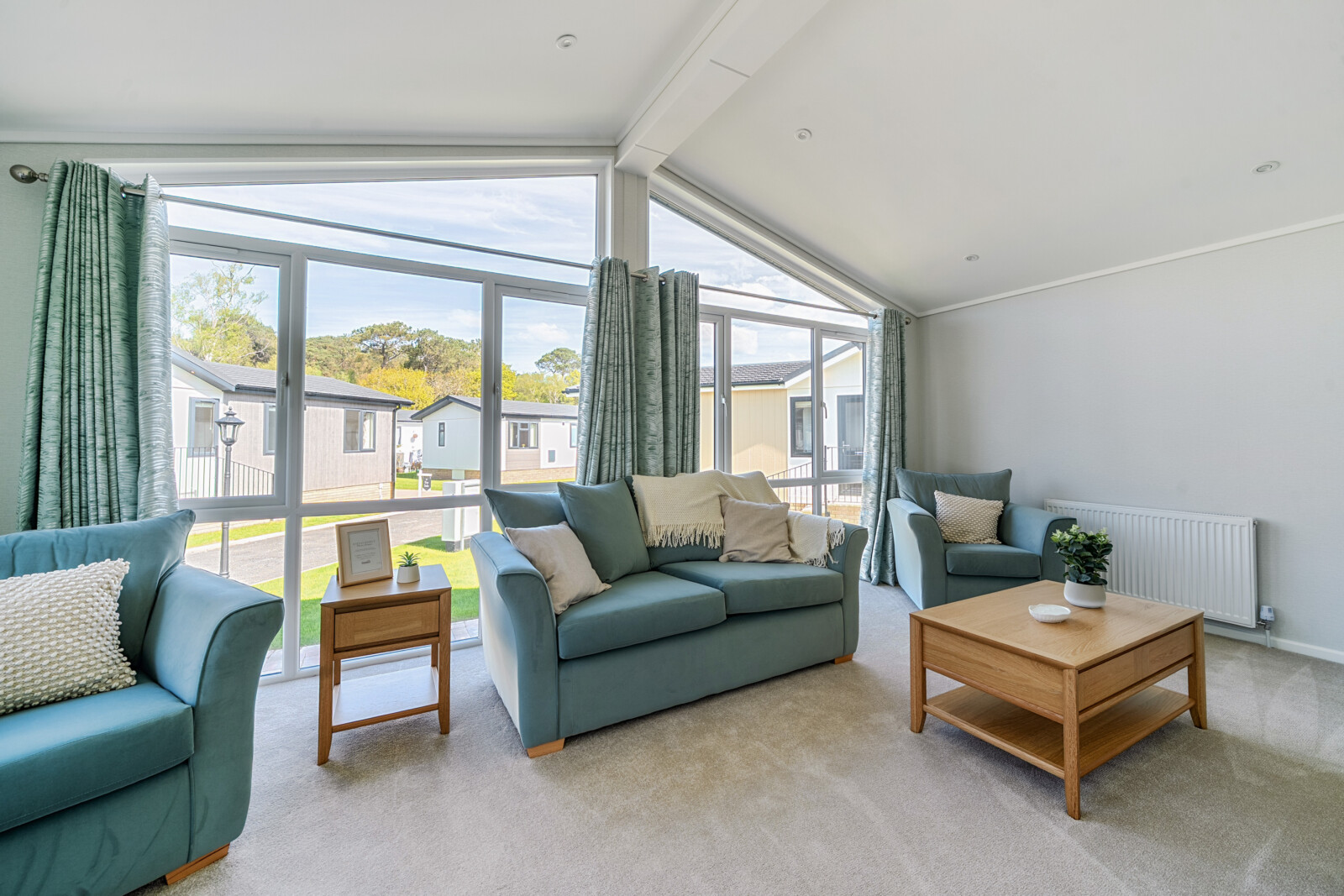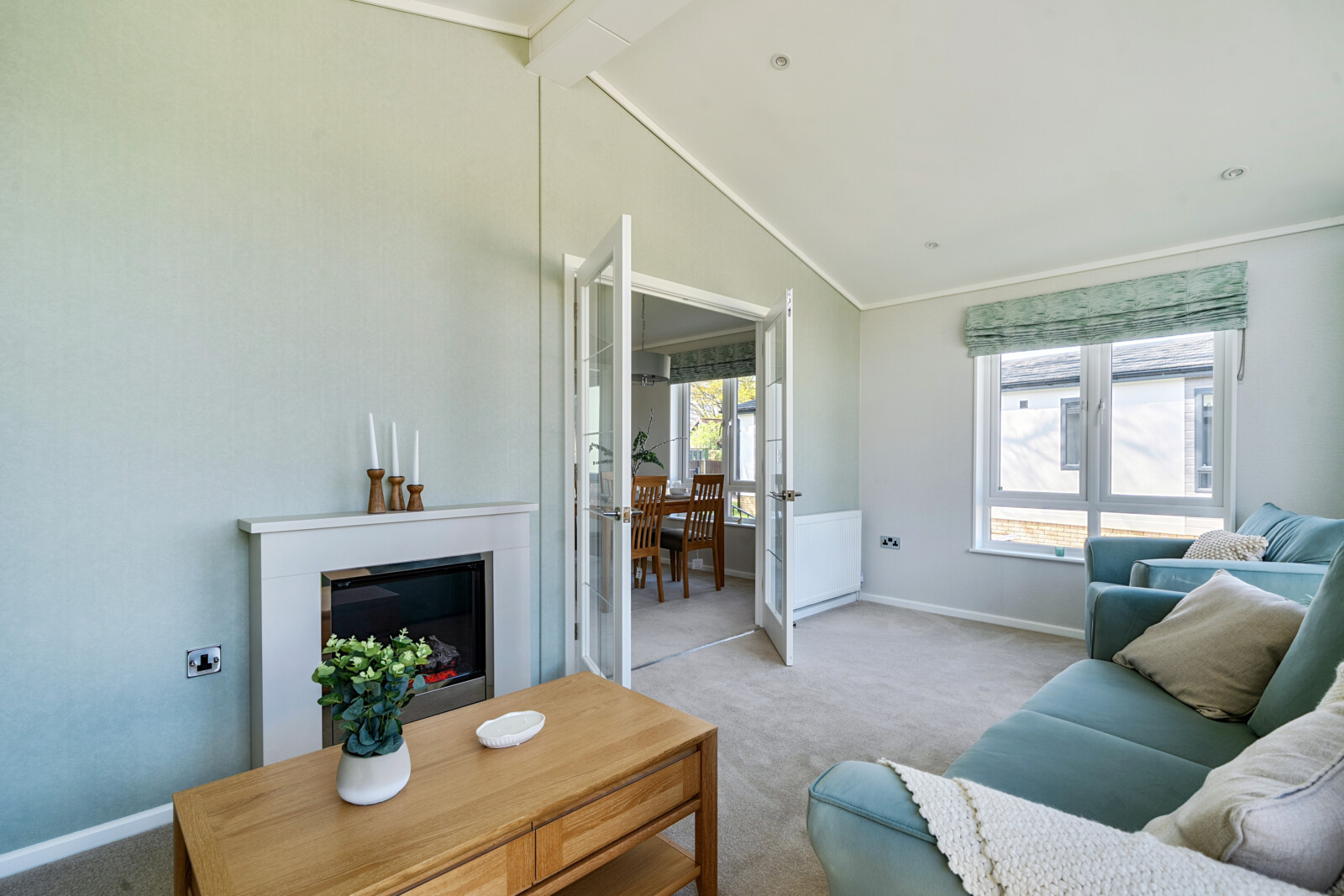 The generous dual-aspect lounge is a perfect blend of style and comfort, featuring a vaulted ceiling and a striking wallpaper feature wall. The elegant space is fully furnished, with a cosy sofa and armchairs, complemented by full-length eyelet style curtains, a coffee table, and a lamp table, making it the ideal spot for relaxation or entertaining. The electric fireplace adds a touch of charm, while the media sockets ensures modern convenience.