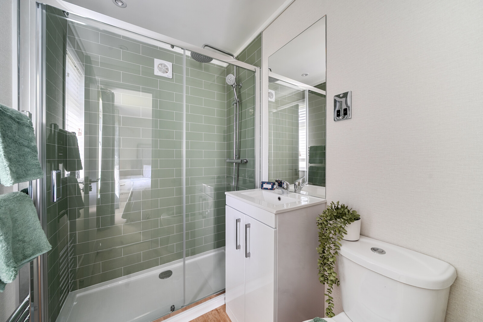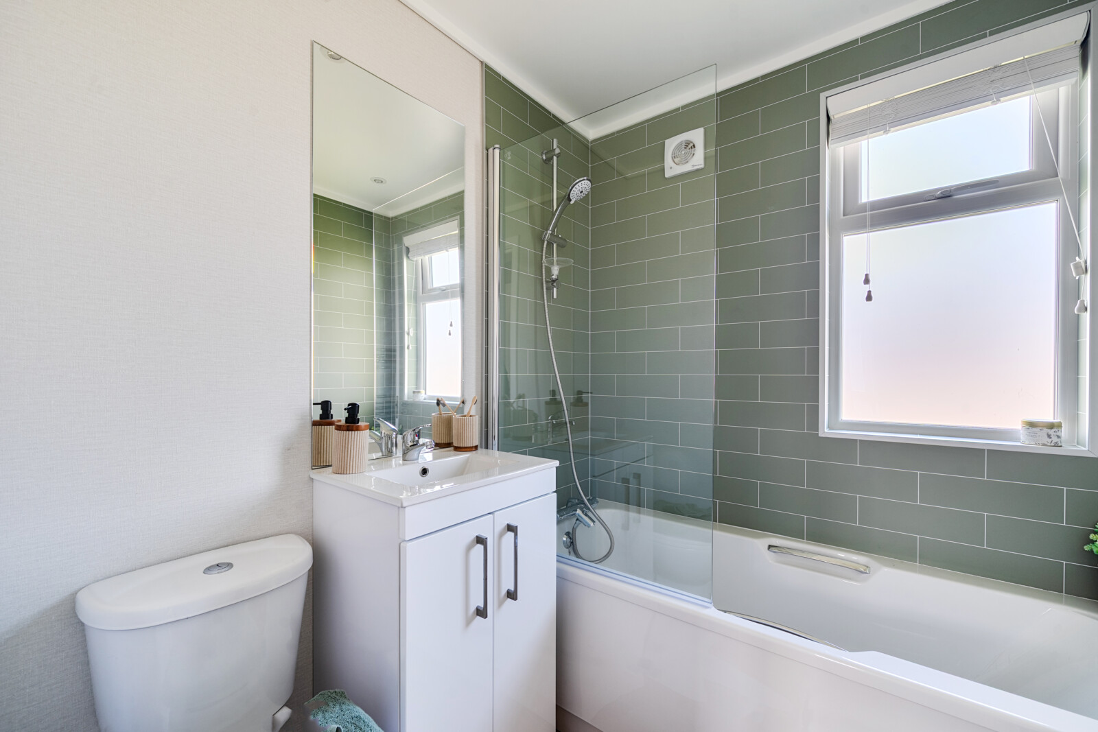 The main bathroom is a sanctuary of relaxation, featuring a bath with an overhead shower mixer, a bath screen, a wall-mounted mirror, and a chrome towel radiator. The Venetian blind and vinyl flooring add to the bathroom’s modern aesthetic, while the shaver socket ensures practicality. The en-suite bathroom, located off the primary bedroom, offers a luxurious walk-in shower with a glass screen, and similar stylish fittings as the main bathroom.