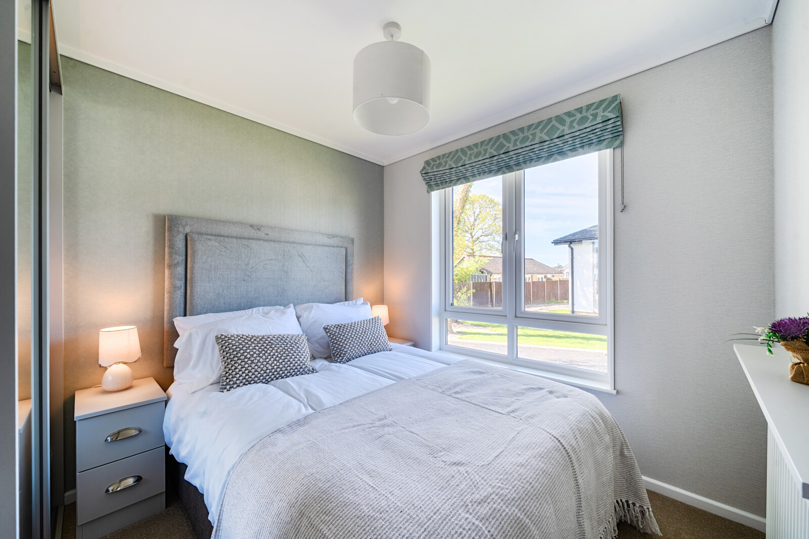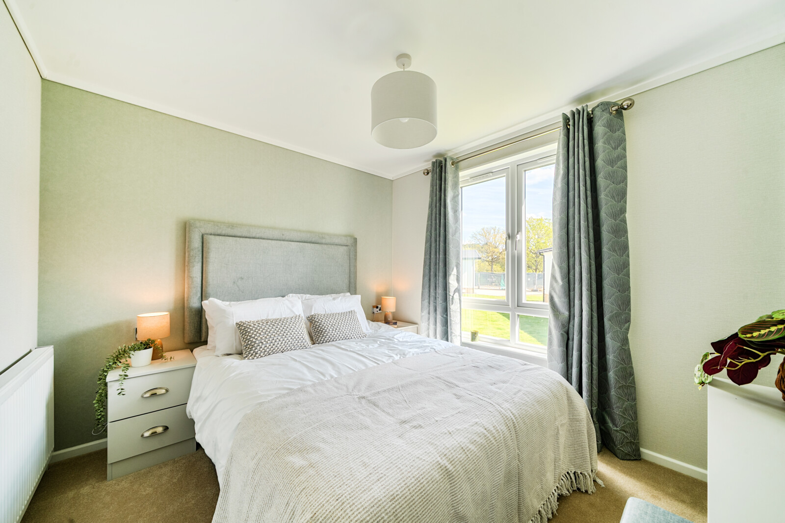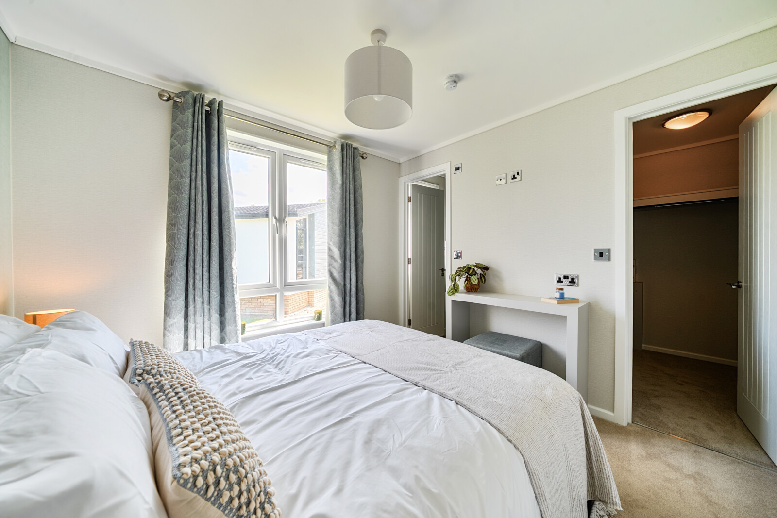 The primary bedroom is a haven of tranquillity and comfort, boasting a superior double bed with a padded headboard, colour-coordinated bed throw, runner, scatter cushions, and curtains. The feature wallpaper wall and spacious walk-in wardrobe enhance the room’s charm. Additional features include freestanding bedside cabinets, a dressing table with a stool, a TV socket, and plush carpet flooring, creating a space that is both luxurious and practical.
