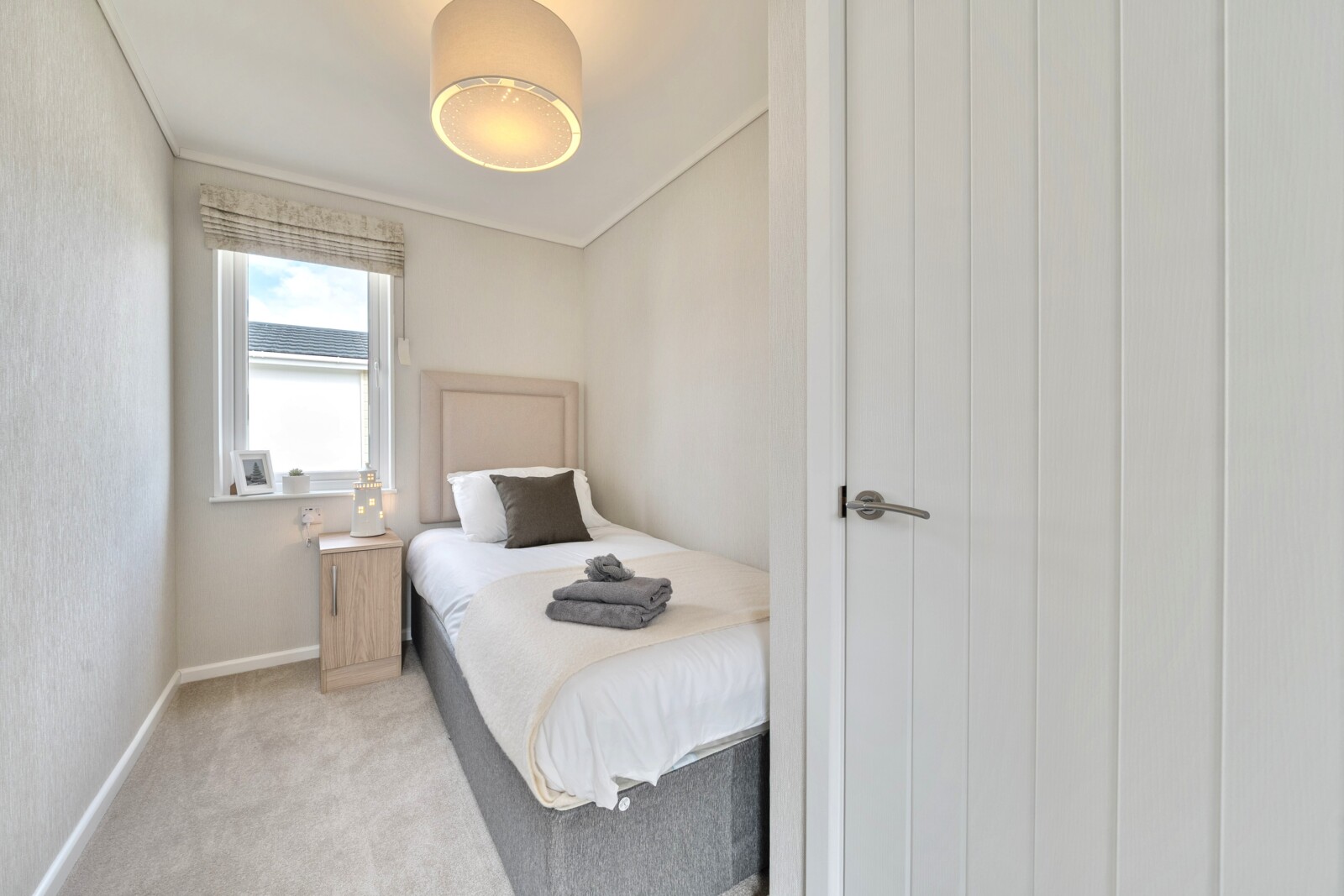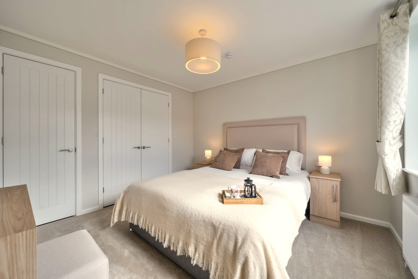 The primary bedroom is a haven of comfort, featuring a superior comfort double bed with a padded headboard, colour-coordinated curtains, and ample storage with fitted wardrobes, bedside tables. A dressing table with a stool and plush carpet flooring complete this serene retreat. The secondary bedroom, perfect for family or friends, includes a single bed, colour-coordinated curtains, a fitted wardrobe, and freestanding bedside cabinets.