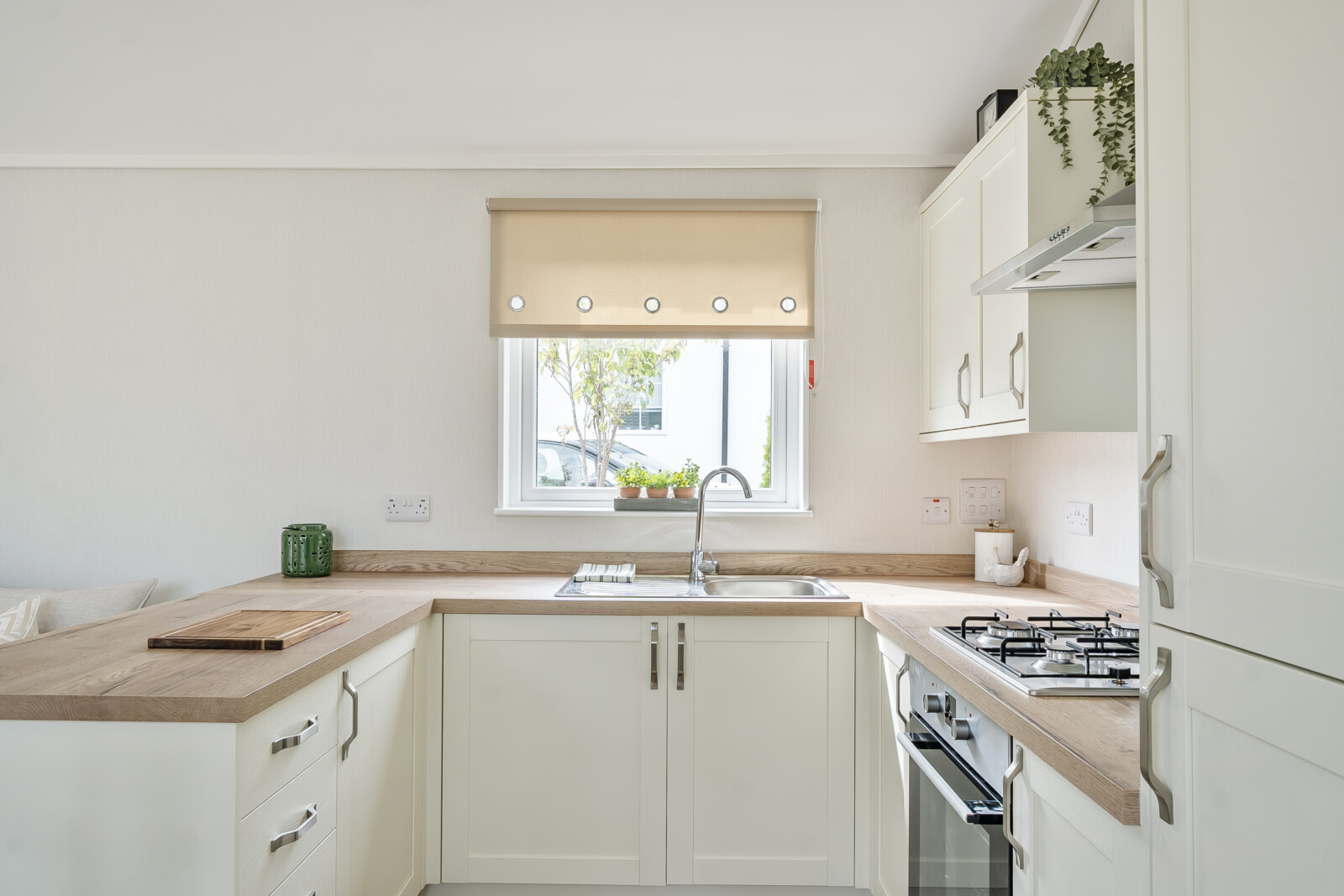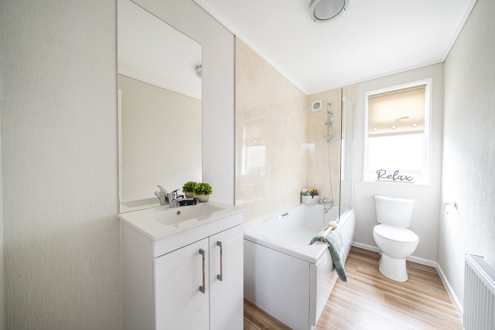 The kitchen and dining area, with its vaulted ceilings and shaker-style units, offer a fulfilling space for culinary adventures. The oak effect worktops and dining table with chairs provide a perfect setting for meals and gatherings. The kitchen is equipped with a single built-in electric oven, a four-burner gas hob, and integrated appliances including a fridge/freezer, and washing machine, ensuring convenience and ease. The vinyl flooring adds a touch of practicality and elegance. The main bathroom invites you to relax and rejuvenate with its tranquil bath featuring grab rails, an extractor fan, a wall-mounted mirror, and a roller blind.