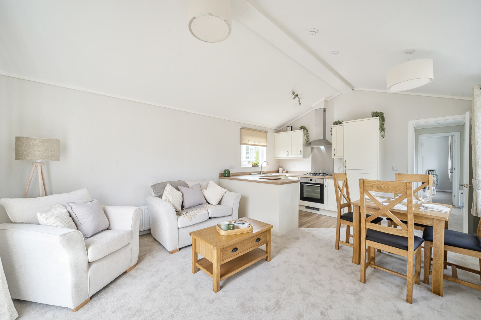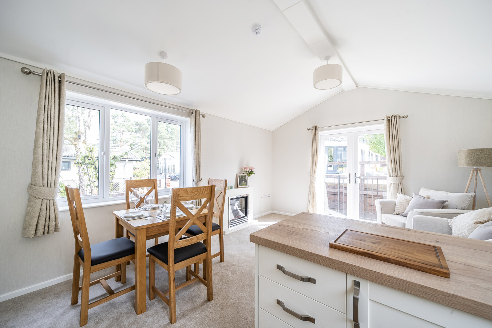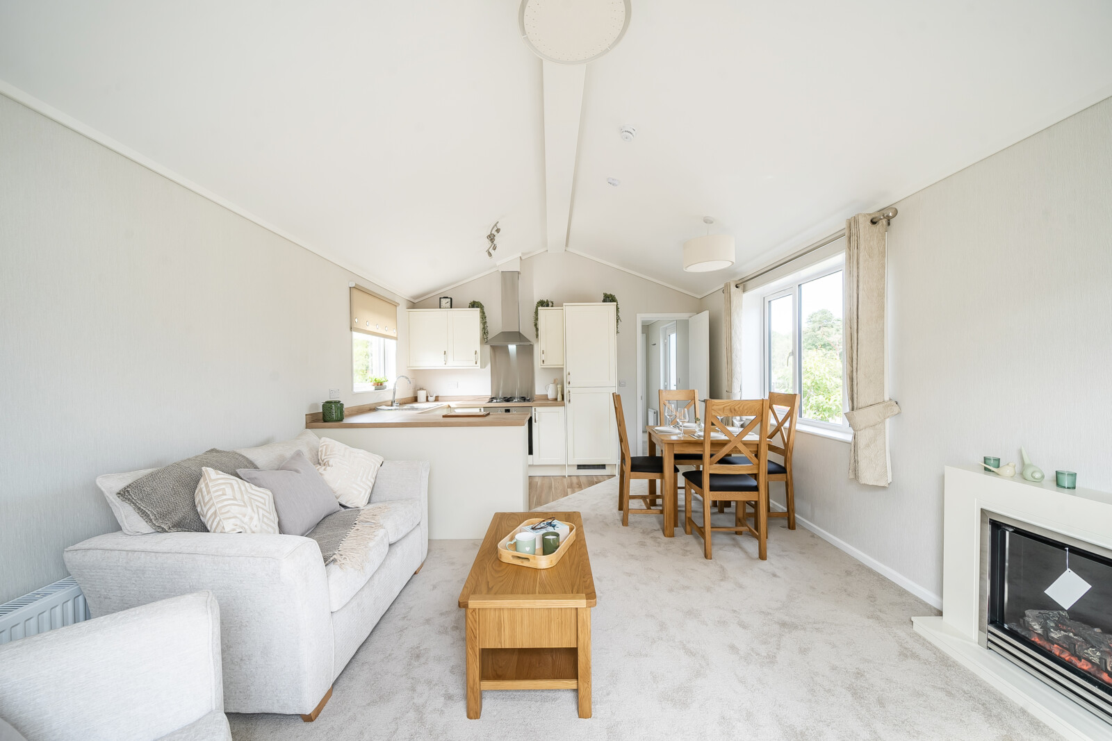 As you step into The Sonata, you are greeted by the warm ambience of the lounge, featuring a vaulted ceiling and an electric fireplace, perfect for creating a tranquil and inviting atmosphere. The lounge is furnished with a comfortable sofa and armchairs, sill-length eyelet-style curtains, and a stylish coffee table. A TV socket and plush carpet flooring complete this delightful space, making it ideal for relaxation and entertainment.