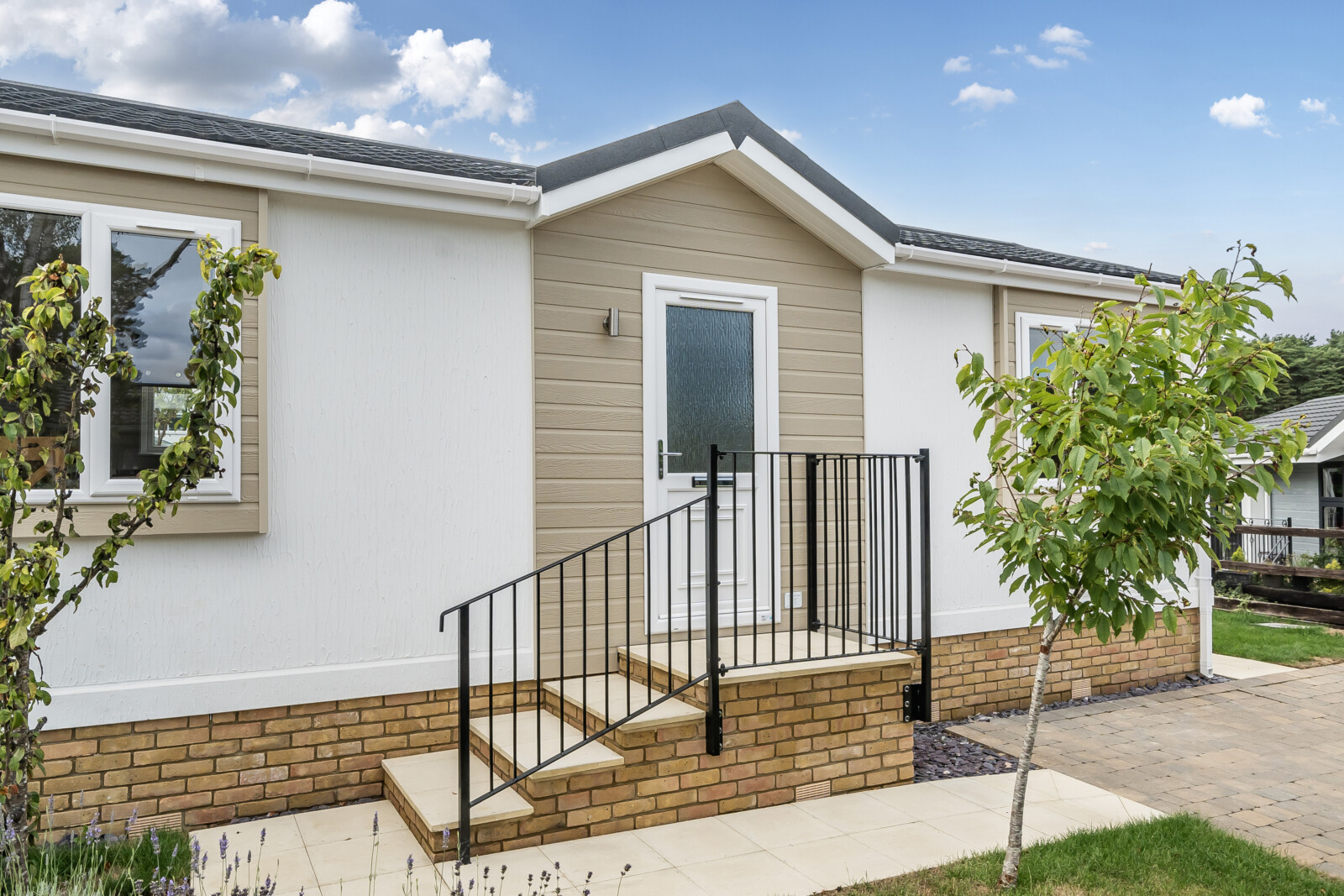 Welcome to The Sonata, a charming and cosy Park Bungalow that is embellished with a stucco textured finish and elegant boxed-out windows with exterior feature cladding. The double-glazed UPVC windows and doors in white, complemented by exterior lights, create an inviting entrance, enhanced by a charming dormer.