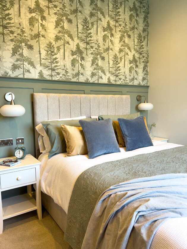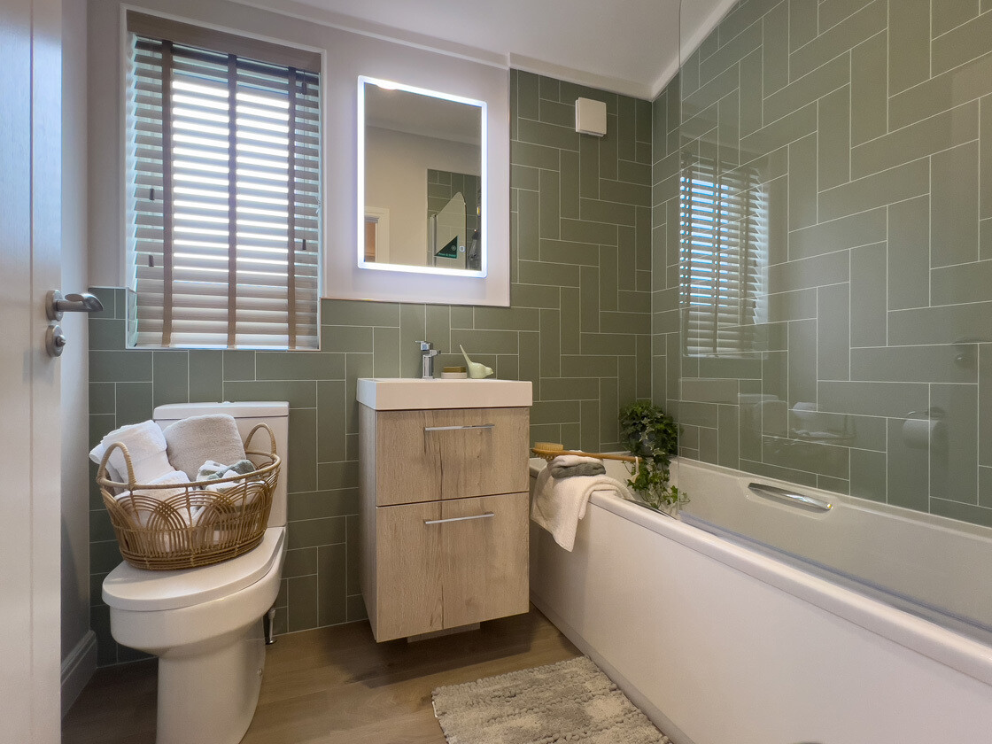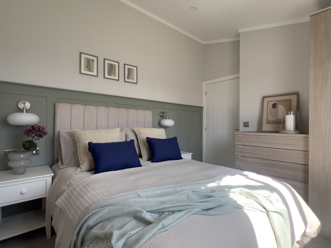 The bedrooms are designed as peaceful retreats. The primary suite features luxury carpet, soft shaker panelling, a fabric headboard, and a beautifully finished en suite with contemporary chrome fittings and a spacious sliding-door shower. The second bedroom mirrors the home’s refined palette with built-in storage and tranquil finishing touches.